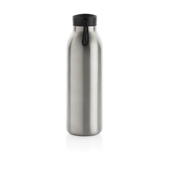 Butelka termiczna 500 ml, podwójne ścianki ze stali nierdzewnej z recyklingu z próżnią pomiędzy, zawartość materiałów z recyklingu obliczona na podstawie wagi całkowitej przedmiotu: 97%, utrzymuje temperaturę napojów ciepłych do 10 godzin oraz zimnych do 20 godzin, pasuje do większości uchwytów samochodowych, w pudełku z certyfikatem FSC®, klasa termiczna: A, ślad węglowy produktu: 1,35 kg CO2