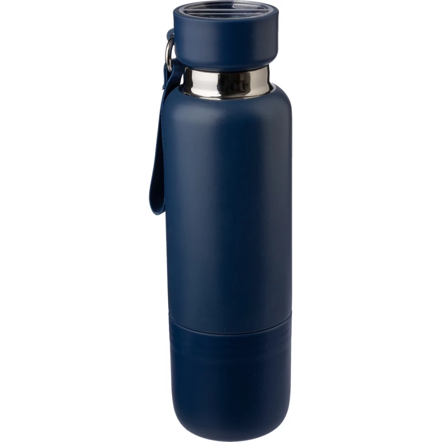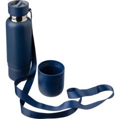 Butelka termiczna 500 ml, posiada podwójne ścianki ze stali nierdzewnej z próżnią między ściankami, co spowalnia oddawanie temperatury na zewnątrz, zachowując funkcje termosu, zakrętka funkcjonująca jako kubek umożliwia wygodne i higieniczne dzielenie się napojem, uchwyt ułatwiający noszenie, matowe wykończenie, produkt wykonany ze stali nierdzewnej, zakrętka z PP, uchwyt z poliestru, utrzymuje temperaturę napojów gorących do 20 godzin +leakproof
