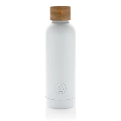 Butelka termiczna 500 ml, podwójne ścianki z próżnią pomiędzy, utrzymuje temperaturę napojów ciepłych do 5 godzin oraz zimnych do 15 godzin, wykonana ze stali nierdzewnej z recyklingu z certyfikatem RSC (Recycled Claim Standard) który gwarantuje, że wykorzystane materiały pochodzą z recyklingu, całkowita zawartość materiału z recyklingu obliczona w oparciu o wagę całkowitą przedmiotu: 88%, w pudełku z papieru kraftowego, ślad węglowy produktu: 2,37 kg CO2