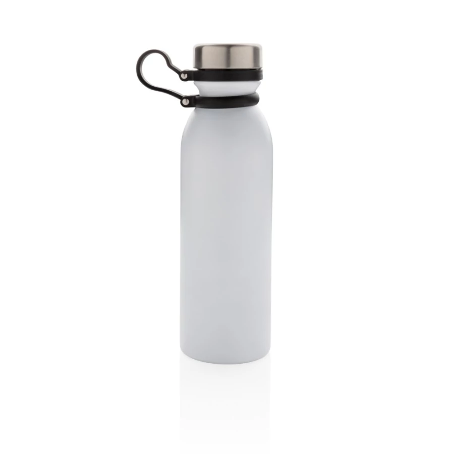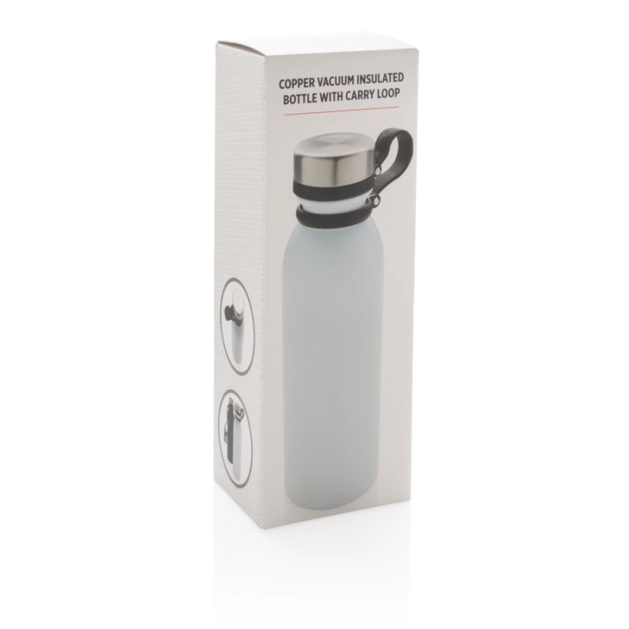 Butelka termiczna 600 ml z silikonowym uchwytem, miedziana izolacja próżniowa, podwójne ścianki z próżnią między ściankami, nie wymaga obsługi oburącz, szczelna zakrętka, specjalna konstrukcja zapobiega kondensacji na zewnątrz butelki, utrzymuje temperaturę napojów gorących do 20 godzin oraz zimnych do 24 godzin
