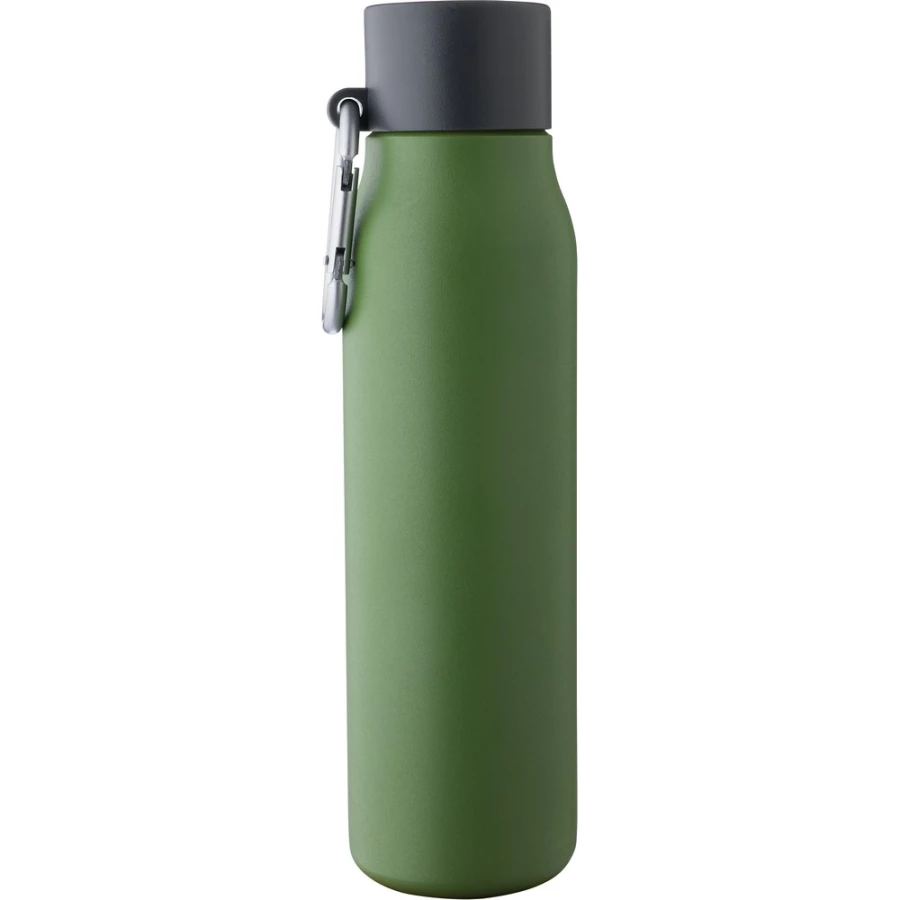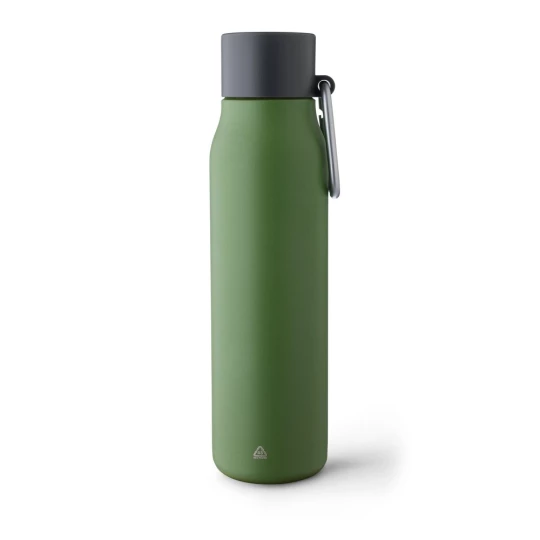 Butelka termiczna 600 ml, uchwyt ułatwiający przenoszenie, utrzymuje temperaturę napojów – ciepłych do 6 godzin, zimnych do 9 godzin, na przedniej części ikona aluminium z recyklingu na produkcie, pakowana pojedynczo w brązowe kartonowe pudełko, wnętrze wykonane ze stali nierdzewnej 304, zewnętrzna warstwa ze stali nierdzewnej 201,szczelna czarna nakrętka z PP, aluminiowy karabińczyk