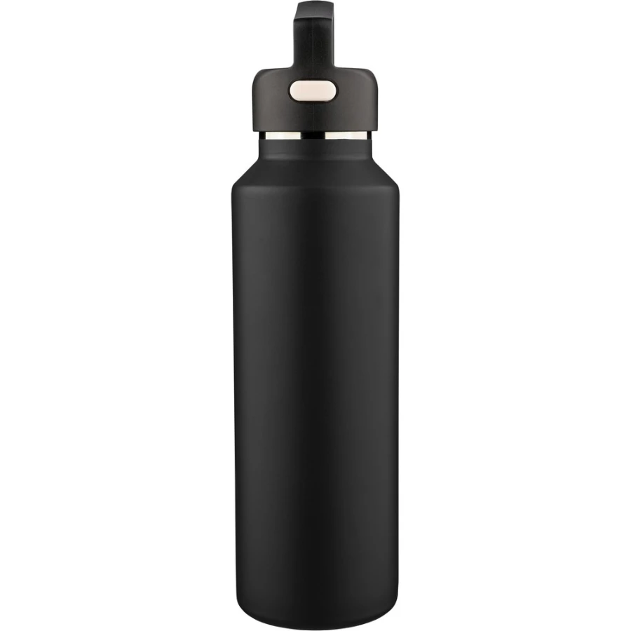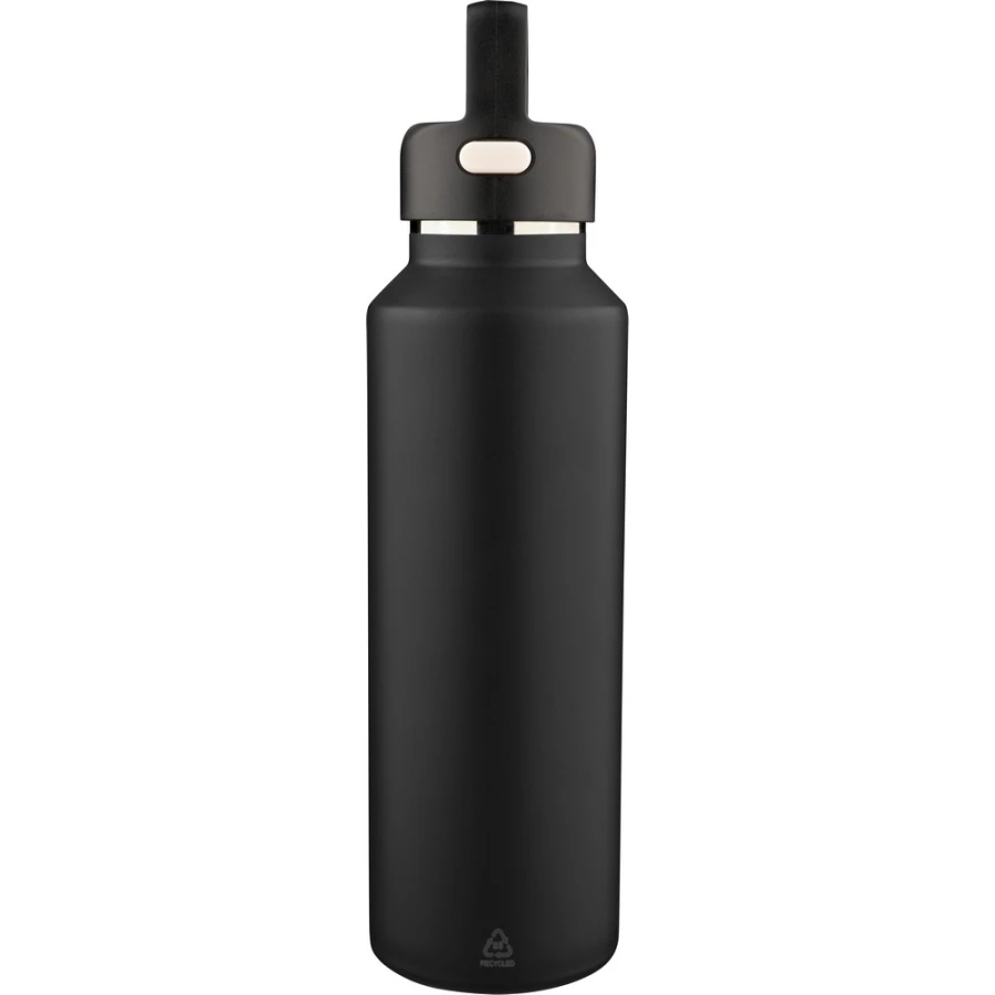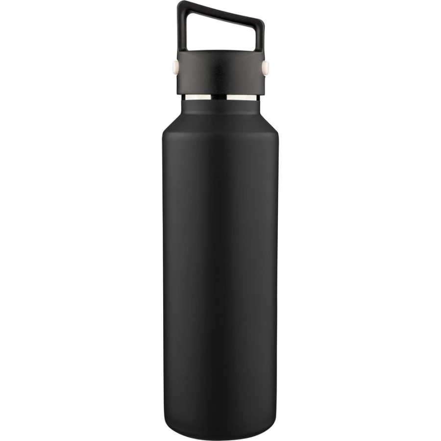 Butelka termiczna 600 ml, posiada podwójne ścianki ze stali nierdzewnej z próżnią między ściankami, co spowalnia oddawanie temperatury na zewnątrz, zachowując funkcje termosu, uchwyt ułatwiający przenoszenie, zawiera przyciski po bokach do otwierania pokrywki, pakowany pojedynczo w brązowe kartonowe pudełko, produkt wykonany z recyklingowej stali nierdzewnej (wewnątrz 304 / na zewnątrz 201) z pokrywką z PP, utrzymuje temperaturę napojów gorących do 4 godzin