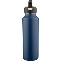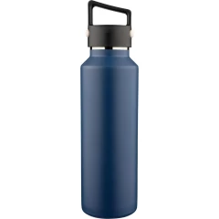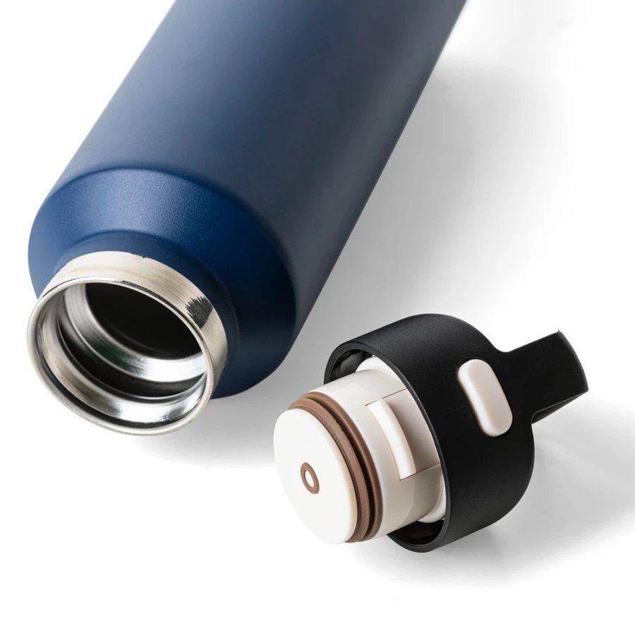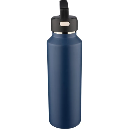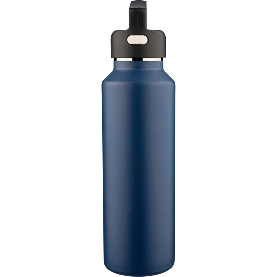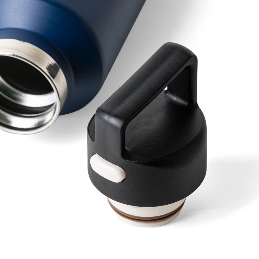 Butelka termiczna 600 ml, posiada podwójne ścianki ze stali nierdzewnej z próżnią między ściankami, co spowalnia oddawanie temperatury na zewnątrz, zachowując funkcje termosu, uchwyt ułatwiający przenoszenie, zawiera przyciski po bokach do otwierania pokrywki, pakowany pojedynczo w brązowe kartonowe pudełko, produkt wykonany z recyklingowej stali nierdzewnej (wewnątrz 304 / na zewnątrz 201) z pokrywką z PP, utrzymuje temperaturę napojów gorących do 4 godzin