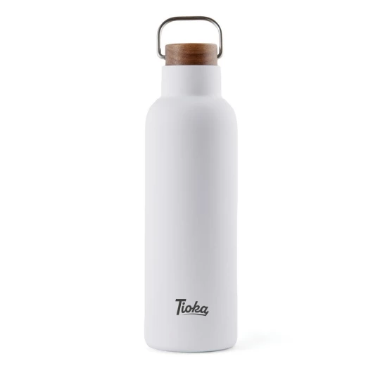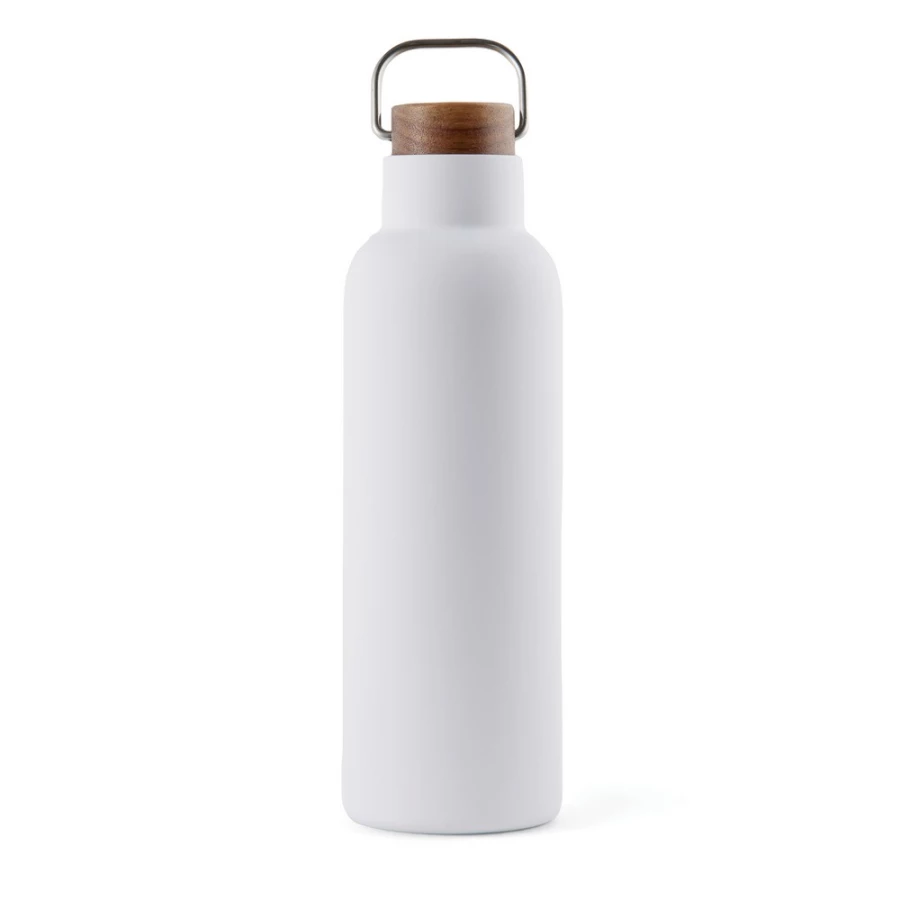 Butelka termiczna 800 ml, podwójne ścianki ze stali nierdzewnej z próżnią pomiędzy, wykonana ze stali nierdzewnej z recyklingu z certyfikatem RCS, drewniane wieczko z uchwytem, całkowita zawartość materiałów z recyklingu obliczona na podstawie wagi całkowitej przedmiotu: 79%, wyłącznie mycie ręczne, w pudełku z papieru kraftowego