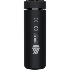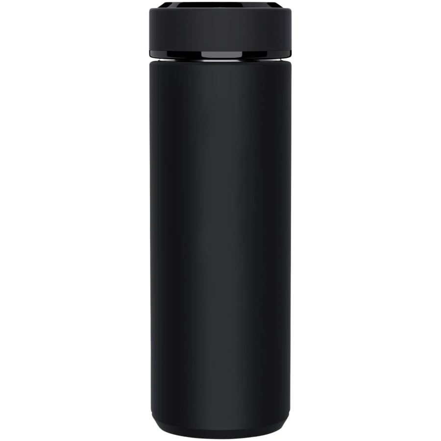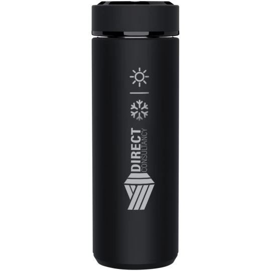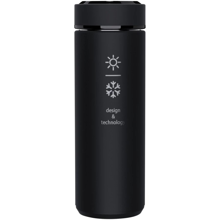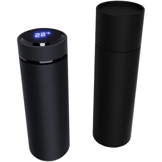 Butelka termiczna o podwójnych ściankach i pojemności 450 ml wykonana ze stali nierdzewnej. Butelka wyposażona jest w termometr. Dzięki systemowi „Touch & Light” temperatura napoju wyświetlana jest na zakrętce butelki (w stopniach Celsjusza). Odpowiednia do gorących i zimnych napojów. Dostarczana w cylindrycznym pudełku upominkowym wykonanym z papieru z recyklingu. Wymiary: 47 x 225 mm. Długość długopisu: CR 2450 (3V). Baterii nie można wymienić. Może wyświetlić temperaturę 20 000 razy.