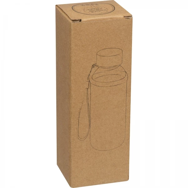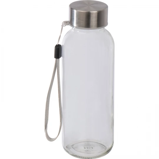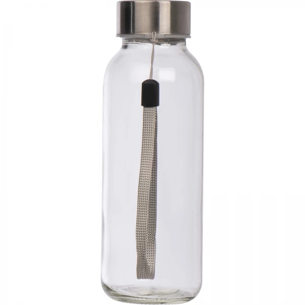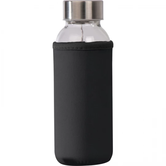 Szklana butelka z uchwytem do przenoszenia, zakrętką ze stali nierdzewnej, w neoprenowym pokrowcu. Pojemność 300 ml.