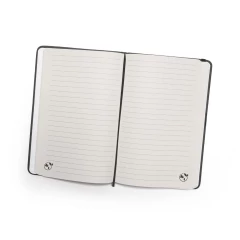 Notatnik A5 wykonany z poliuretanu (35%) i poliuretanu (15%) pochodzącego z recyklingu. Twarda okładka wykonana jest w 100% z kartonu pochodzącego z recyklingu. Zawiera 192 kartki w linie, w 100% z recyklingu, w kolorze kości słoniowej, pasek rozdzielający i gumkę do zamykania notatnika. 138 x 210 mm