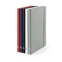 Notatnik A5 wykonany z poliuretanu (35%) i poliuretanu (15%) pochodzącego z recyklingu. Twarda okładka wykonana jest w 100% z kartonu pochodzącego z recyklingu. Zawiera 192 kartki w linie, w 100% z recyklingu, w kolorze kości słoniowej, pasek rozdzielający i gumkę do zamykania notatnika. 138 x 210 mm