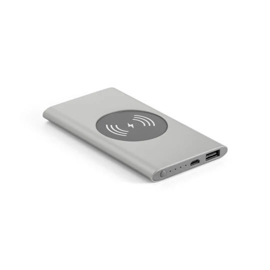 Power bank z bezprzewodową ładowarką, solidna i smukła konstrukcja idealna do codziennego użytku. Wskaźnik poziomu naładowania baterii LED ułatwia sprawdzenie, kiedy należy ją naładować.Materiał: aluminium z recyklingu (100% rAL)Pojemność: 4000 mAhMoc ładowania bezprzewodowego: 5 WWejście: USB-C (10 W)Wyjście: USB-A (10 W)W zestawie: kabel USB-A / USB-CDostawa: papierowe pudełko prezentowe typu kraftWymiary: 123 x 70 x 10 mm