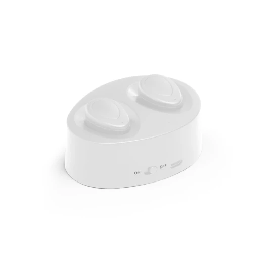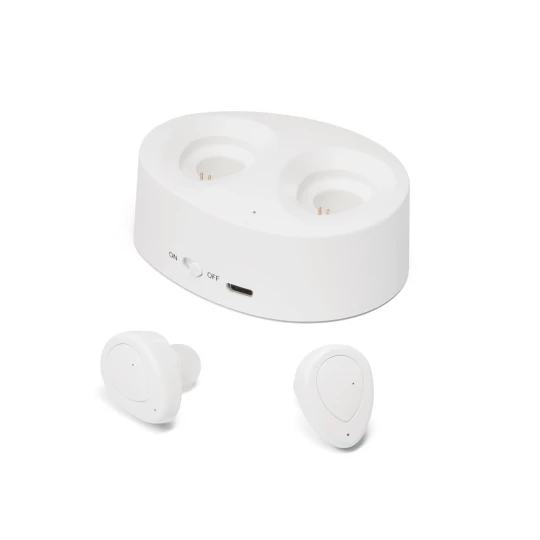 Słuchawki bezprzewodowe z łatwą w obsłudze podstawką ładującą. Ciesz się muzyką lub rozmowami bez obawy o wyczerpanie baterii.Materiał: ABSTransmisja bezprzewodowa: BTFunkcje: rozmowy w trybie głośnomówiącym, regulacja głośności i sterowanie listą odtwarzania na urządzeniu mobilnymW zestawie: pudełko prezentoweWymiary: Słuchawki: 27 x 20 x 28 mm | Podstawa: 77 x 60 x 29 mm | Pudełko: 83 x 83 x 40 mm