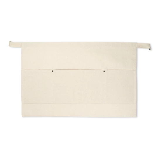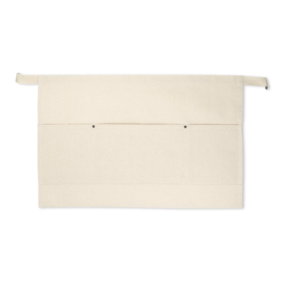 Wielofunkcyjny fartuch z płótna bawełnianego (260 g/m²) z 3 kieszeniami z przodu i wiązaniem w pasie. Produkt wyprodukowany zgodnie z certyfikowaną normą dotyczącą stosowania szkodliwych substancji w tekstyliach. 580 x 375 mm