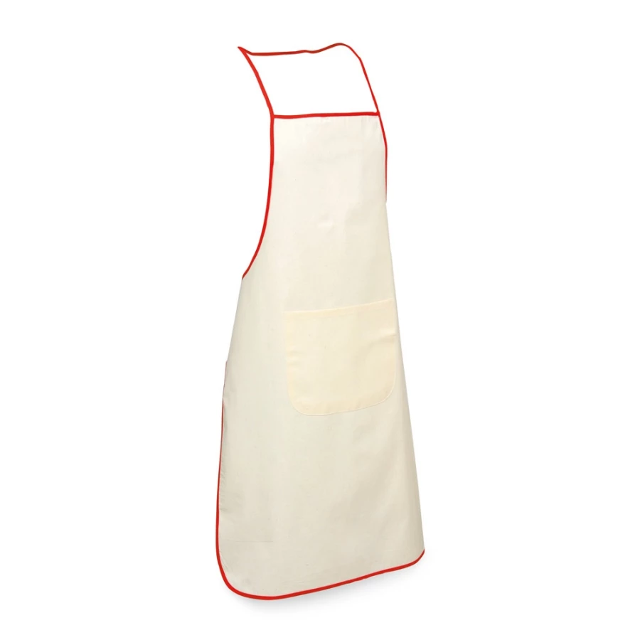 Fartuch z miękkiego materiału 100% bawełny (105 g/m²), kolor naturalnego włókna, z kolorowymi detalami. Fartuch z 1 przednią kieszenią i sznurkami do ściągania. 600 x 900 mm | Kieszeń: 250 x 200 mm