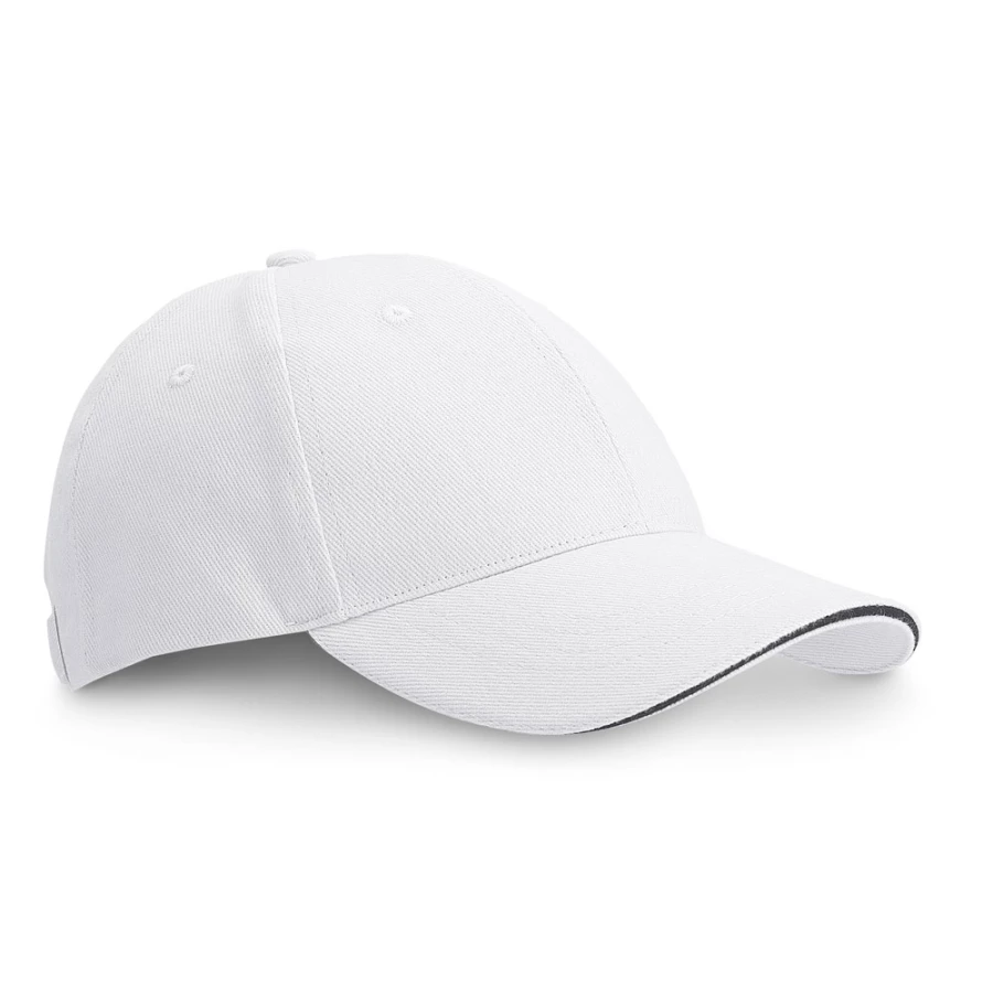 Czapka z daszkiem typu „sandwich”, 100% bawełna szczotkowana, z 6 panelami i wyszywanymi otworami wentylacyjnymi (260 g/m²). Regulacja za pomocą metalowej klamry. Rozmiar: 580 mm
