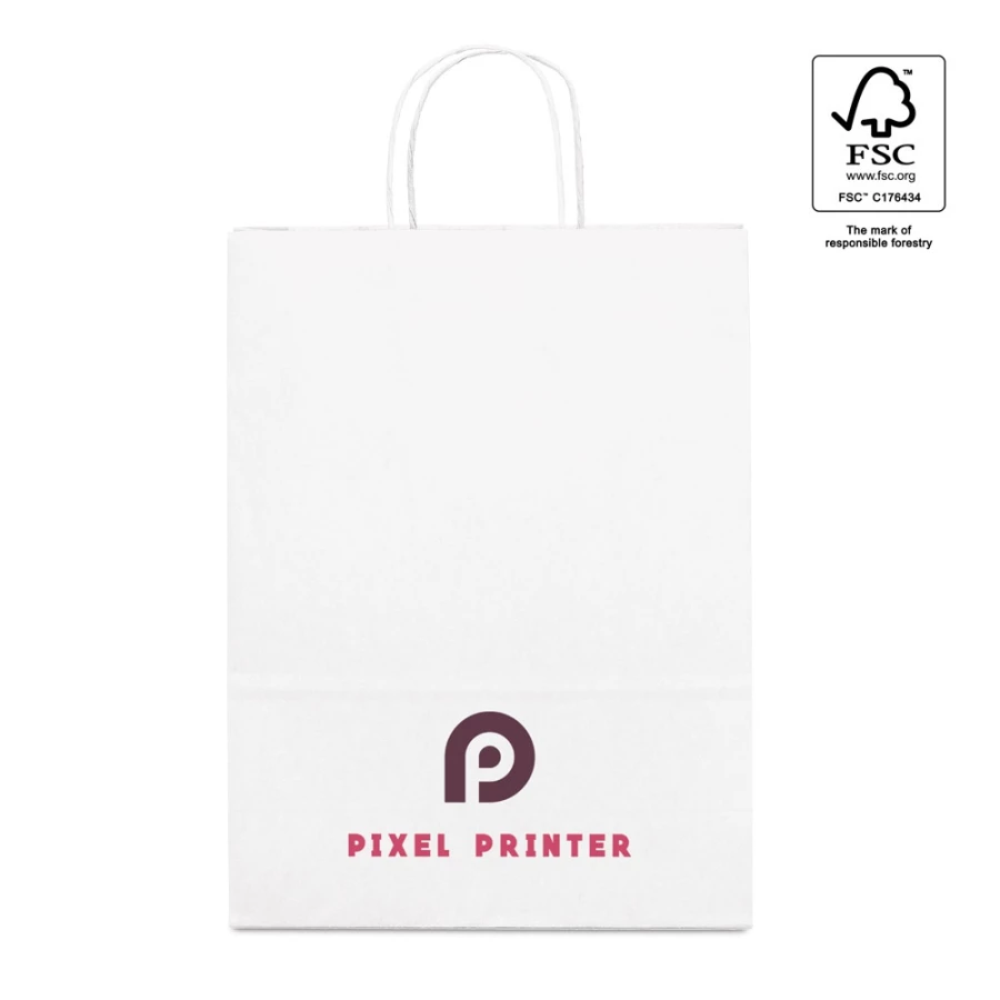 Torba papierowa Kraft (90 g/m²) ze skręcanym uchwytem. Wyprodukowano w Europie. Ten produkt jest wykonany z materiałów z certyfikatem FSC™ i innych kontrolowanych materiałów. 230 x 180 x 80 mm