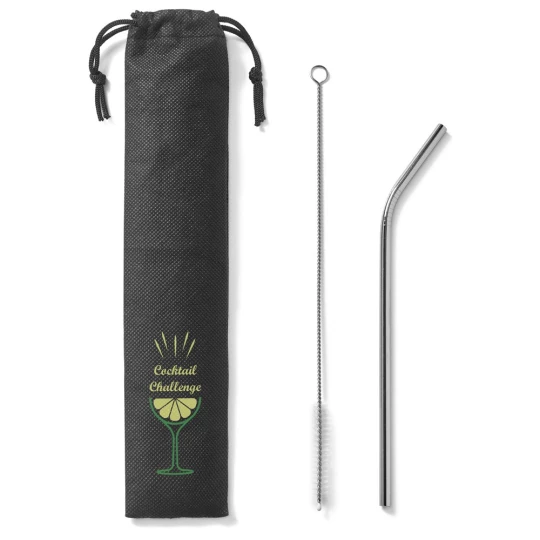 Zestaw ze słomką ze stali nierdzewnej wielokrotnego użytku i szczoteczką do czyszczenia. Dostarczany w woreczku non-woven (80 g/m²) z zamknięciem na sznurek. Słomka: ø6 x 215 mm | Torba: 60 x 265 mm