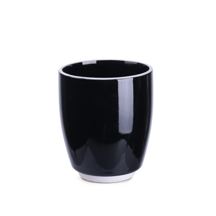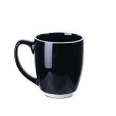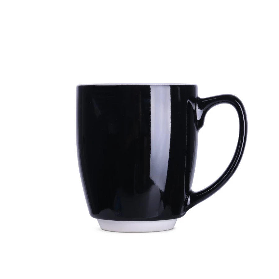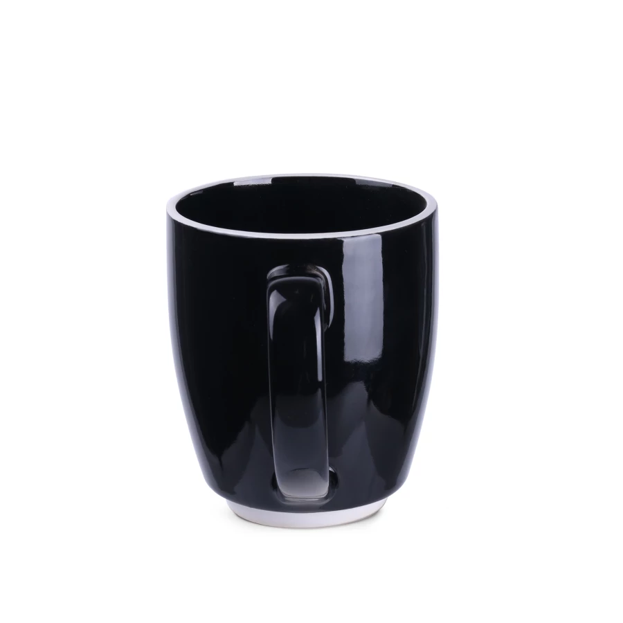 Designerski czarny kubek reklamowy o obłym kształcie z charakterystycznymi białymi wykończeniami na rancie oraz w dolnej części. Model o dużej pojemności.