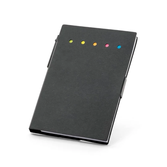 Notes z kolorowymi samoprzylepnymi kartkami, zawierający 6 zestawów (25 arkuszy każdy) i notatnik (70 g/m²) ze 100 gładkimi kartkami. W zestawie długopis. Ten produkt jest wykonany z materiałów z certyfikatem FSC™ i innych kontrolowanych materiałów. 100 x 150 mm