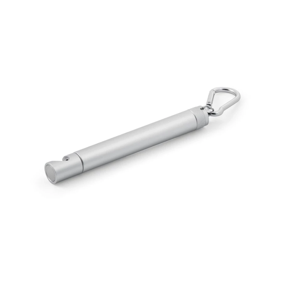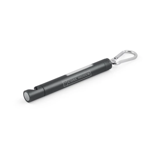 Aluminiowa latarka z diodą COB, otwieraczem do butelek, karabińczykiem i magnesem na jednym z końców. Zawiera 5 baterii LR44. ø15 x 130 mm