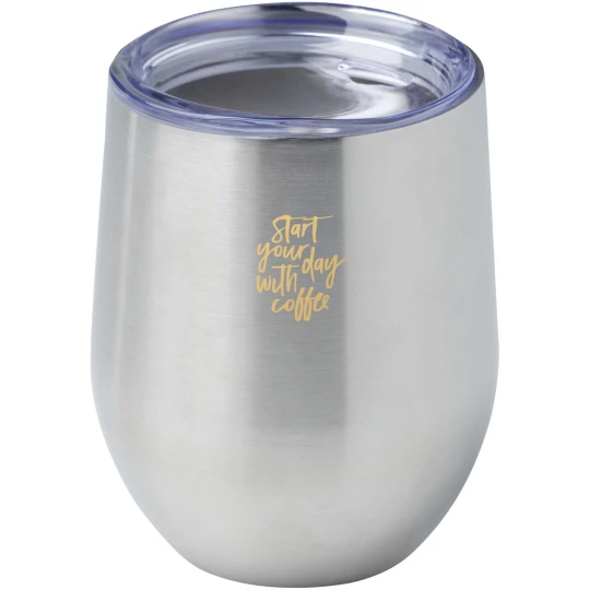 Corzo ze stali nierdzewnej z certyfikatem RCS z dwuścienną konstrukcją próżniową i miedzianą izolacją, która utrzymuje wysoką temperaturę napojów przez 6 godzin lub niską przez 24 godziny. Konstrukcja zapobiega kondensacji na zewnątrz kubka. Łatwe picie, pokrywa typu push-on. Farba proszkowa na zewnętrznej powłoce. Szeroki otwór dla wygodnego napełniania i opróżniania. Pojemność 350 ml. Zapakowana w pudełko upominkowe wykonane z kartonu z recyklingu.