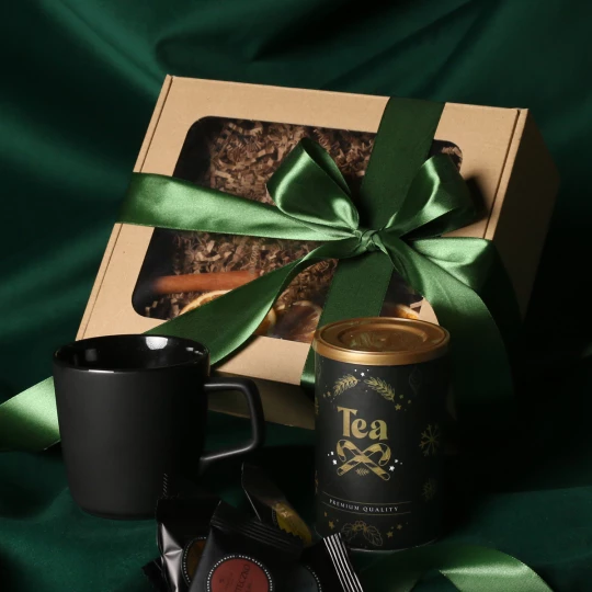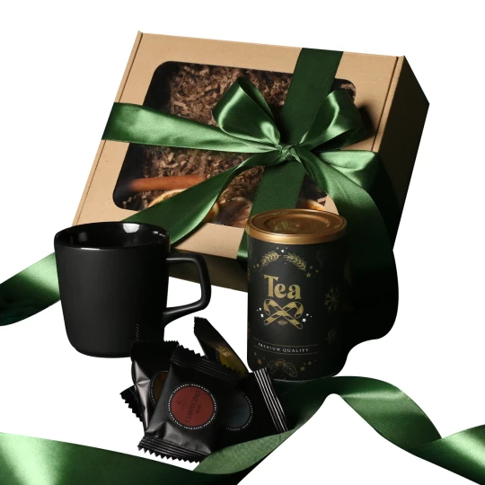 kubek Barrel Supreme czarno-czwrwony / czarny-reflex blue / czarny-czarny z możliwością zdobienia, zielona herbata Sencha z wiśniami, płatkami róży zapakowana w tubę z motywem zimowym, 8 stuk czekoladek - mix smaków. Całość w stylowym opakowaniu z tektury eco z okienkiem.