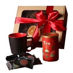 kubek Barrel Supreme czarno-czwrwony / czarny-reflex blue / czarny-czarny z możliwością zdobienia, zielona herbata Sencha z wiśniami, płatkami róży zapakowana w tubę z motywem zimowym, 8 stuk czekoladek - mix smaków. Całość w stylowym opakowaniu z tektury eco z okienkiem.