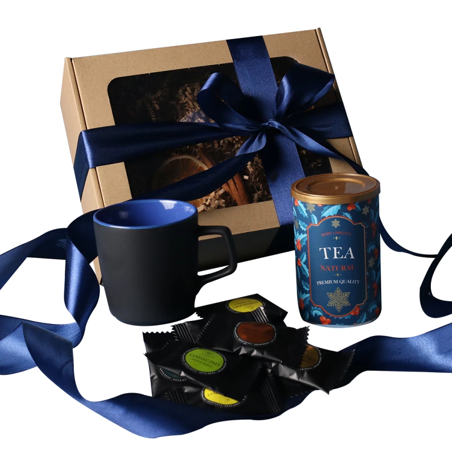 kubek Barrel Supreme czarno-czwrwony / czarny-reflex blue / czarny-czarny z możliwością zdobienia, zielona herbata Sencha z wiśniami, płatkami róży zapakowana w tubę z motywem zimowym, 8 stuk czekoladek - mix smaków. Całość w stylowym opakowaniu z tektury eco z okienkiem.
