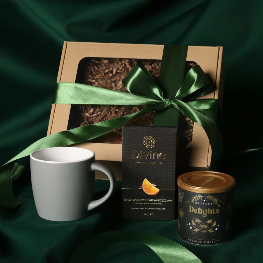 Opcje dodatkowej customizacji: nadruk na kubku, bilecik z logo firmy, wstążka lub obwoluta z motywem zimowym wzbogacona złoceniem.