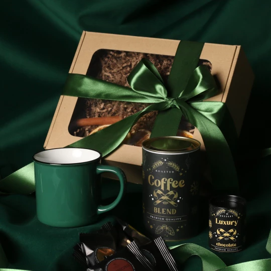 W skład zestawu wchodzą: kubek Loft ciemnozielony-biały / Loft Supreme czarny-czerwony / czarny-czarny z możliwością zdobienia, Arabica Cerrado Mineiro - kawa ziarnista zapakowana w tubę z motywem zimowym, 8 stuk czekoladek - mix smaków Luxury Chocolate - Czekolada Belgijska do picia w tubie z motywem zimowym. Całość w stylowym opakowaniu z tektury eco z okienkiem.