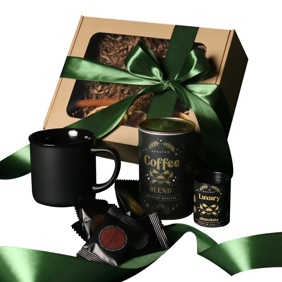 W skład zestawu wchodzą: kubek Loft ciemnozielony-biały / Loft Supreme czarny-czerwony / czarny-czarny z możliwością zdobienia, Arabica Cerrado Mineiro - kawa ziarnista zapakowana w tubę z motywem zimowym, 8 stuk czekoladek - mix smaków Luxury Chocolate - Czekolada Belgijska do picia w tubie z motywem zimowym. Całość w stylowym opakowaniu z tektury eco z okienkiem.