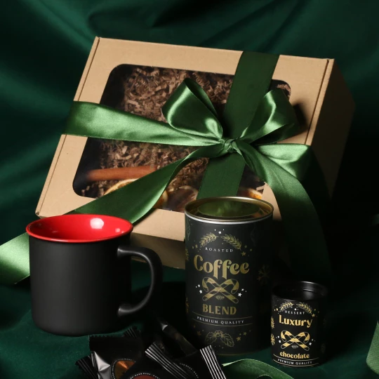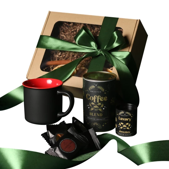 W skład zestawu wchodzą: kubek Loft ciemnozielony-biały / Loft Supreme czarny-czerwony / czarny-czarny z możliwością zdobienia, Arabica Cerrado Mineiro - kawa ziarnista zapakowana w tubę z motywem zimowym, 8 stuk czekoladek - mix smaków Luxury Chocolate - Czekolada Belgijska do picia w tubie z motywem zimowym. Całość w stylowym opakowaniu z tektury eco z okienkiem.