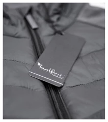 połączenie tkaniny pikowanej i softshellowej, krój taliowany za pomocą bocznych części, zamek błyskawiczny na całej długości z ochroną podbródka, boczne kieszenie z zamkiem błyskawicznym, wewnętrzna kieszonka na suwak, lekko przedłużona w tylnej części, dostęp do brandingu w części tylnej