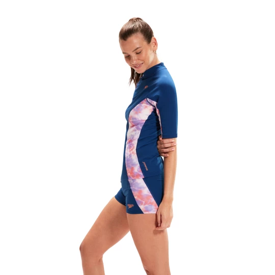 Materiał ECO Endurance+ cechujący się wytrzymałością Wciągany rash top - idealny do ochrony przed słońcem zarówno w wodzie jak i poza nią Płaskie szwy delikatne dla skóry Szlufki do krótkich spodenek - podłączenie do sznurka ściągającego spodenki lub legginsy dla dodatkowego zabezpieczenia Wygodne dopasowanie 100% odporność na chlor - dla długotrwałej wydajności Quick Dry - materiał szybkoschnący Jedna z przędz w tkaninie ECO Endurance + jest wykonana w 100% z odpadów pokonsumpcyjnych, takich jak przetworzone plastikowe butelki.