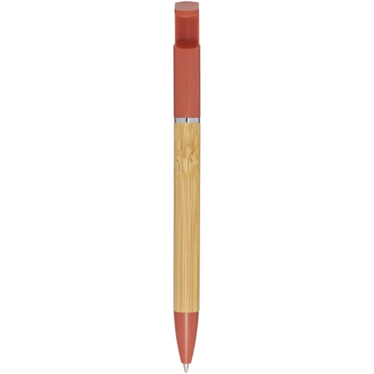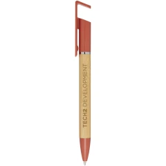 Bambusowy długopis, który pełni także funkcję uchwytu na telefon. Przycisk i środkowy pierścień wykonane są z tworzyw sztucznych pochodzących z recyklingu, końcówka z mosiądzu, a korpus z bambusa pozyskiwanego w sposób zrównoważony. Kolor tuszu: Czarny. Żywotność: 1000 metrów. Rozmiar stalówki: 1,0 mm.