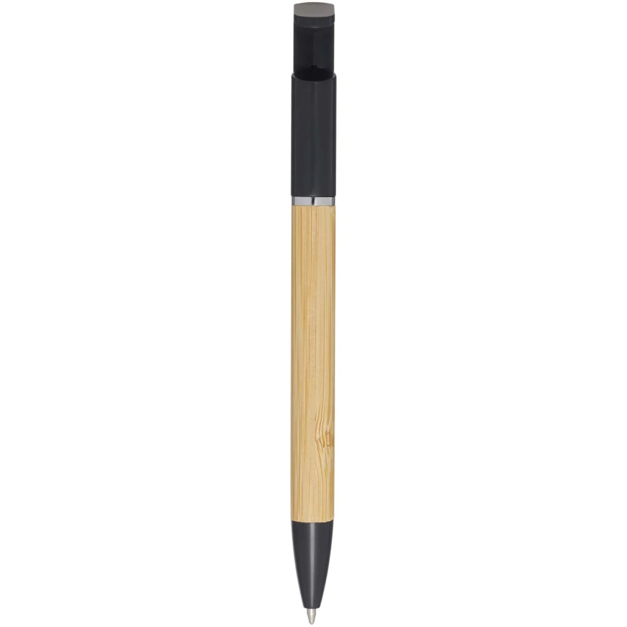 Bambusowy długopis, który pełni także funkcję uchwytu na telefon. Przycisk i środkowy pierścień wykonane są z tworzyw sztucznych pochodzących z recyklingu, końcówka z mosiądzu, a korpus z bambusa pozyskiwanego w sposób zrównoważony. Kolor tuszu: Czarny. Żywotność: 1000 metrów. Rozmiar stalówki: 1,0 mm.