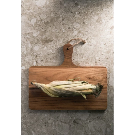 Deska do krojenia, serwowania, z uchwytem, wykonana z drewna tekowego z certyfikatem FSC®, które dzięki swoim naturalnym właściwościom z czasem ciemnieje, dzięki wysokiej zawartości oleju drewno jest bardzo odporne i wytrzymałe