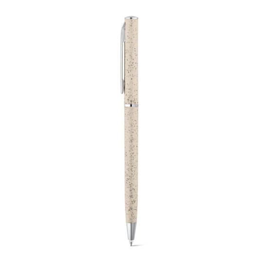 Długopis z włókna ze słomy pszenicy i ABS, z mechanizmem obrotowym i metalowym klipsem. Czarny wkład. Ponieważ produkt jest wykonany z naturalnych materiałów, kolor produktu oraz wynik drukowania mogą się różnić w zależności od produktu. ø8 x 126 mm