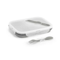Wysuwane hermetyczne pudełko wykonane z silikonu i PP, z 2 przegrodami o pojemnościach do 480 mL i 760 mL. W górnej części wieczka znajduje się miejsce na przechowywanie dołączonego do zestawu widelca i noża (2 w 1). Nadaje się do użytku w kuchence mikrofalowej (należy zdjąć wieczko). 212 x 153 x 73 mm | Złożone: 212 x 153 x 38 mm