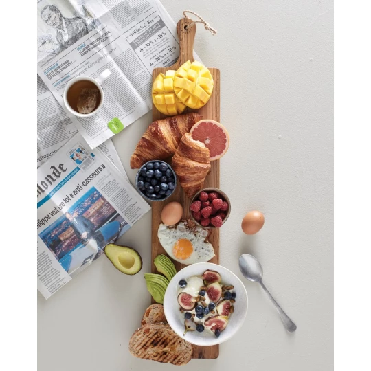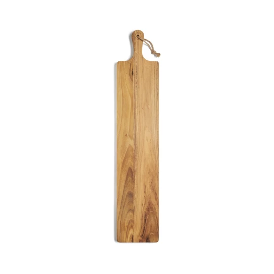 Deska do krojenia, serwowania, duży rozmiar, wykonana z drewna tekowego z certyfikatem FSC®, które dzięki swoim naturalnym właściwościom z czasem ciemnieje, dzięki wysokiej zawartości oleju drewno jest bardzo odporne i wytrzymałe