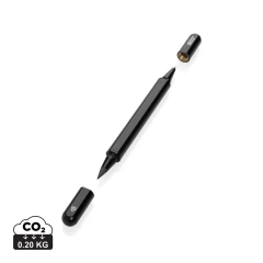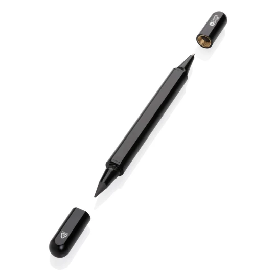Długopis 2 w 1, „wieczny” ołówek ze specjalnie wolnościerającą się grafitową końcówką, niebieski wkład, długość pisania ok. 1200 m, wykonany z aluminium z recyklingu z certyfikatem RCS, całkowita zawartość materiałów obliczona na podstawie wagi całkowitej przedmiotu: 83%