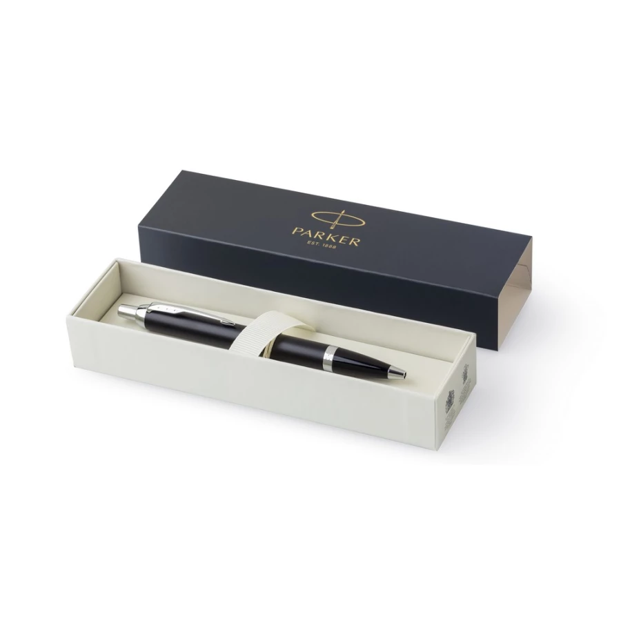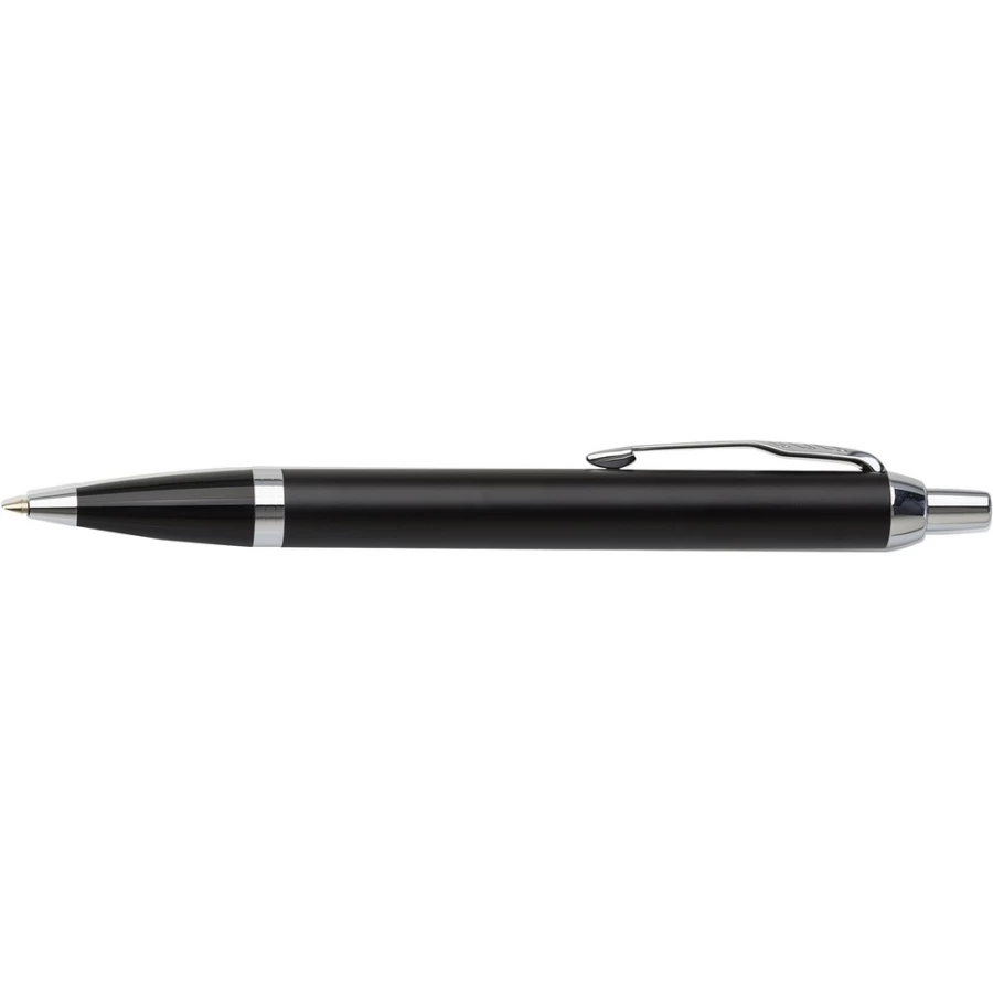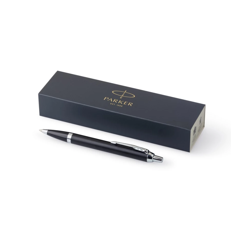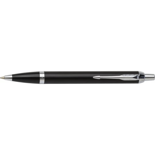 Długopis Parker IM, wkład w niebieskim kolorze, grawer ukazuje powierzchnię w kolorze złotym, zapakowany w pudełko upominkowe, produkt wykonany z metalu