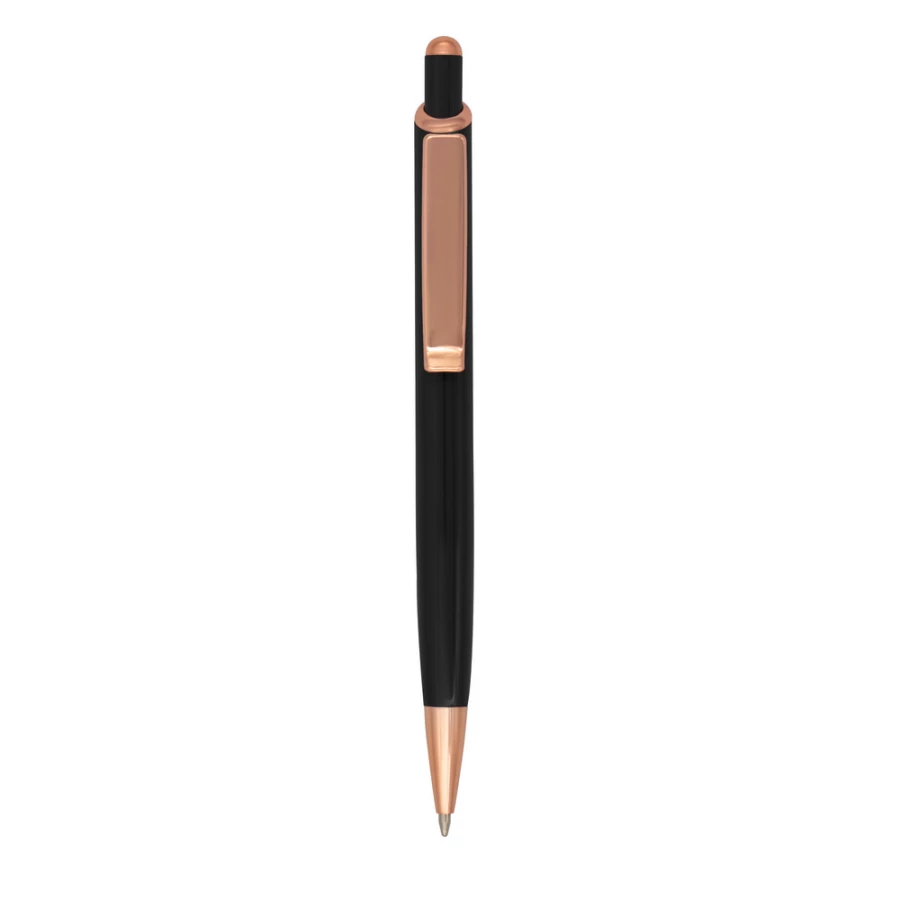 Długopis z kolorowym trzonem i błyszczącymi elementami kolorze różowego złota, wkład w niebieskim kolorze, grawer ukazuje powierzchnię w kolorze złotym, produkt wykonany z aluminium