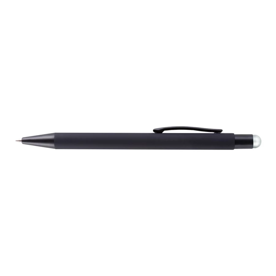 Długopis z czarnym trzonem, posiada gumowe wykończenie, kolorowa końcówka touch pen umożliwiająca obsługę ekranów dotykowych, grawer ukazuje matową powierzchnię w kolorze białym, wkład w niebieskim kolorze, produkt wykonany z aluminium i plastiku