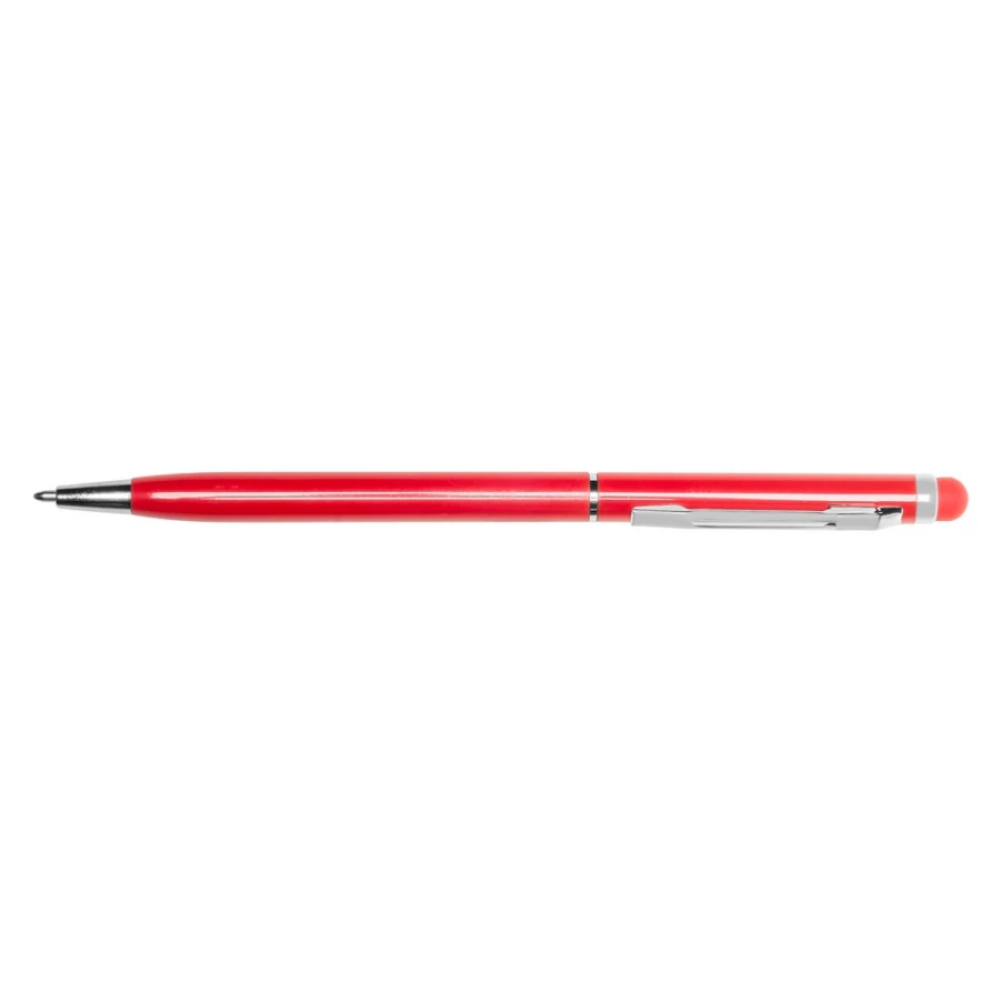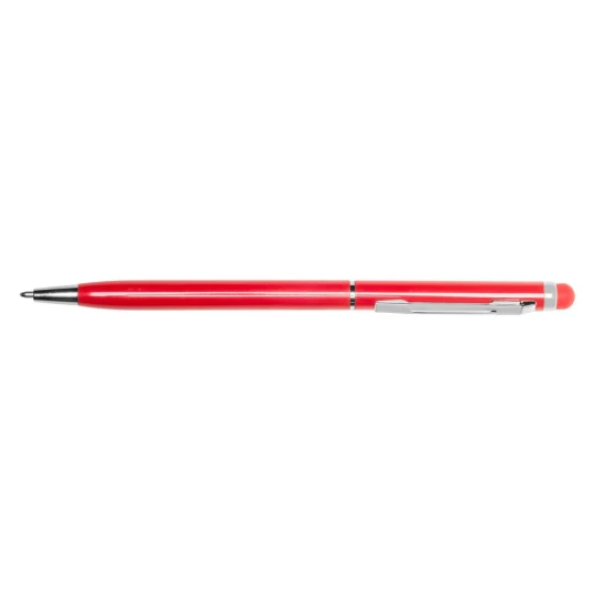 Długopis z kolorowym trzonem o błyszczącym wykończeniu, niewielka średnica nadaje nowoczesnego wyglądu, dopasowana kolorystycznie końcówka touch pen umożliwiająca obsługę ekranów dotykowych, wkład w niebieskim kolorze, produkt wykonany z aluminium