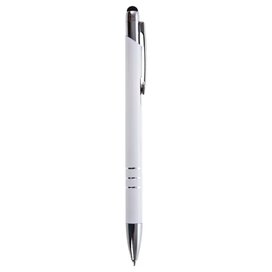 Długopis z kolorowym trzonem o błyszczącym wykończeniu, posiada elementy w kolorze srebrnym, końcówka touch pen umożliwiająca obsługę ekranów dotykowych, wkład w niebieskim kolorze, produkt wykonany z aluminium