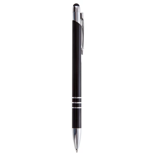 Długopis z kolorowym trzonem o błyszczącym wykończeniu, posiada elementy w kolorze srebrnym, końcówka touch pen umożliwiająca obsługę ekranów dotykowych, wkład w niebieskim kolorze, produkt wykonany z aluminium