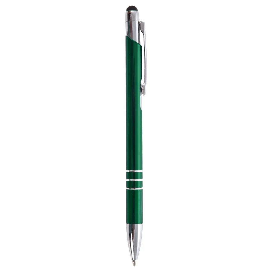 Długopis z kolorowym trzonem o błyszczącym wykończeniu, posiada elementy w kolorze srebrnym, końcówka touch pen umożliwiająca obsługę ekranów dotykowych, wkład w niebieskim kolorze, produkt wykonany z aluminium