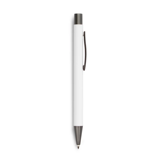 Długopis z kolorowym trzonem i szarymi elementami, posiada gumowe wykończenie, wkład w niebieskim kolorze, produkt wykonany z aluminium, plastiku i metalu