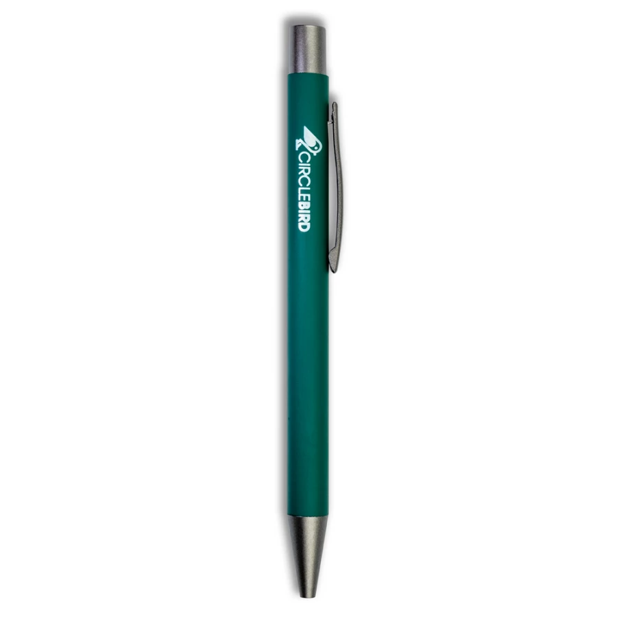 Długopis z kolorowym trzonem i szarymi elementami, posiada gumowe wykończenie, wkład w niebieskim kolorze, produkt wykonany z aluminium, plastiku i metalu