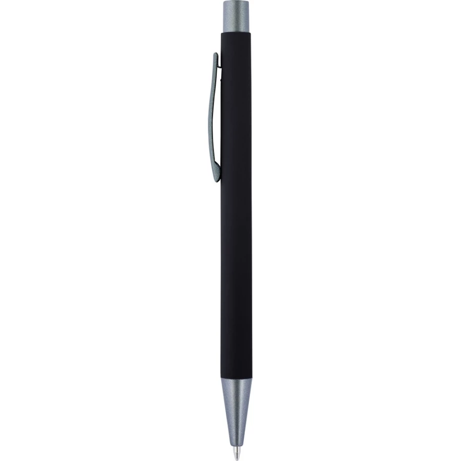 Długopis z kolorowym, gumowanym trzonem i szarymi elementami, grawer ukazuje lustrzaną powierzchnię