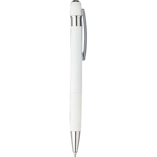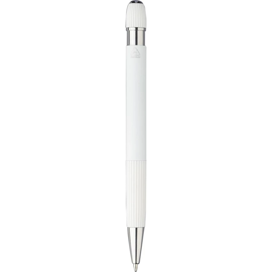 Długopis wykonany z aluminium, gumowe wykończenie, paskowane detale na trzonie i w górnej części, chromowana plastikowa końcówka, przycisk z metalowym klipsem, niebieski tusz, ikona recyklingu na produkcie
